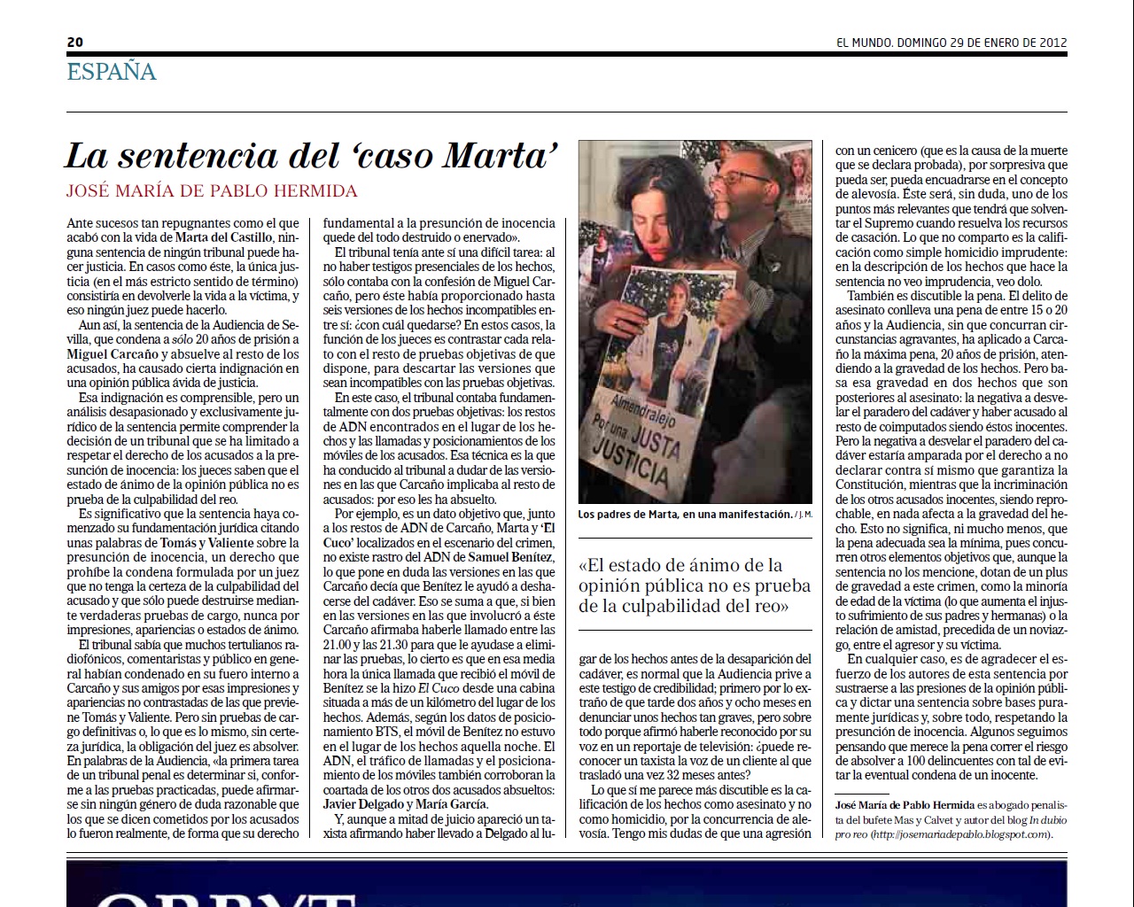 Ante sucesos tan repugnantes como el que acabó con la vida de Marta del Castillo, ninguna sentencia de ningún tribunal puede hacer justicia. En casos como este, la única justicia (en el más estricto sentido del término) consistiría en devolverle la vida a la víctima, y eso ningún juez puede hacerlo. Aun así, la sentencia de la Audiencia Provincial de Sevilla, que condena a “solo” 20 años de prisión a Miguel Carcaño, y absuelve al resto de los acusados, ha causado cierta indignación, en una opinión pública ávida de justicia.